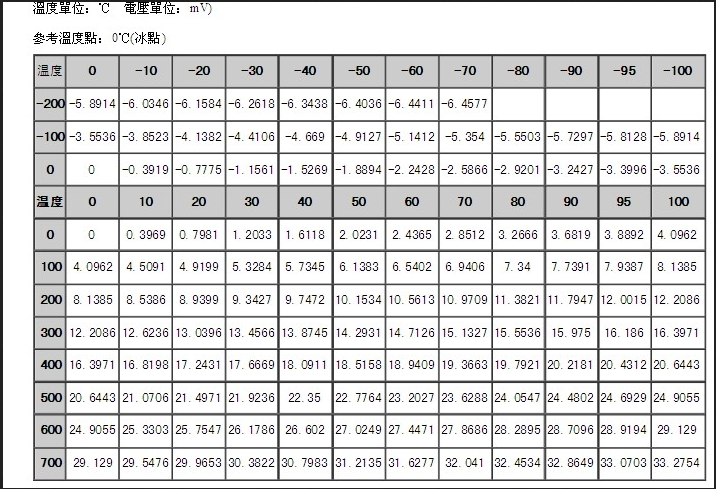 K型熱電偶不同溫度對(duì)應(yīng)的電壓值,豎排是百進(jìn)位溫度,橫排是10進(jìn)位溫度,比如找260度的電壓值,先在豎排找到200度的檔, 再水平找到60度對(duì)應(yīng)的位置,10.5613就是260度對(duì)應(yīng)的電壓值。 K型熱電偶分度表![]()